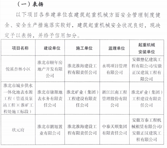 2025年7月21日,淮北市建筑工程管理處發(fā)布了2025年建筑起重機(jī)械安全專(zhuān)項(xiàng)檢查情況通報(bào),淮海建工公司承建的悅溪杏林小區(qū)、狀元府兩個(gè)項(xiàng)目在安全管理制度健全、安全生產(chǎn)措施落實(shí)及建筑起重機(jī)械安全狀況良好等方面表現(xiàn)突出,獲得市建管處通報(bào)表?yè)P(yáng)的同時(shí)也為公司贏得了信用加分!